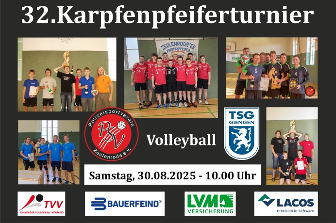 Nach der längsten Sockenwäscheleine (Guinsess-Rekord) in Zeulenroda ruft diesen Samstag das nächste Highlight. Ab 10.00 Uhr findet das 32.Karpfenpfeiferturnier in der Jahnturnhalle statt. Neben den drei PSV- Teams spielen die TSG Giengen und der TV Weißendorf um die hölzerne Trophäe.
